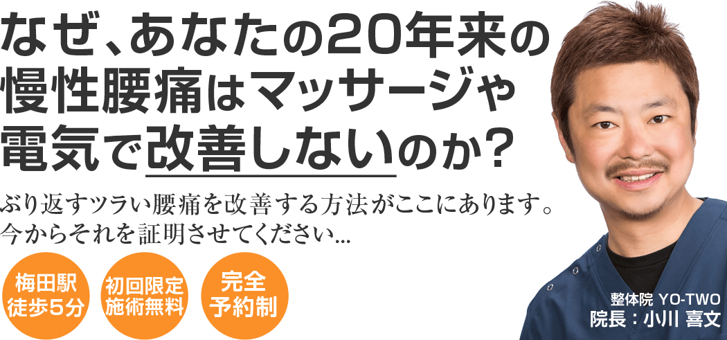 国家資格を持ち、病院勤務・整骨院院長経験で多くの経験を持つ、あなたの症状に真正面から向き合ってくれる大阪で唯一の腰痛専門整体院YO-TWOに来院し、もう二度とその痛みに我慢することのない人生を手に入れる道。