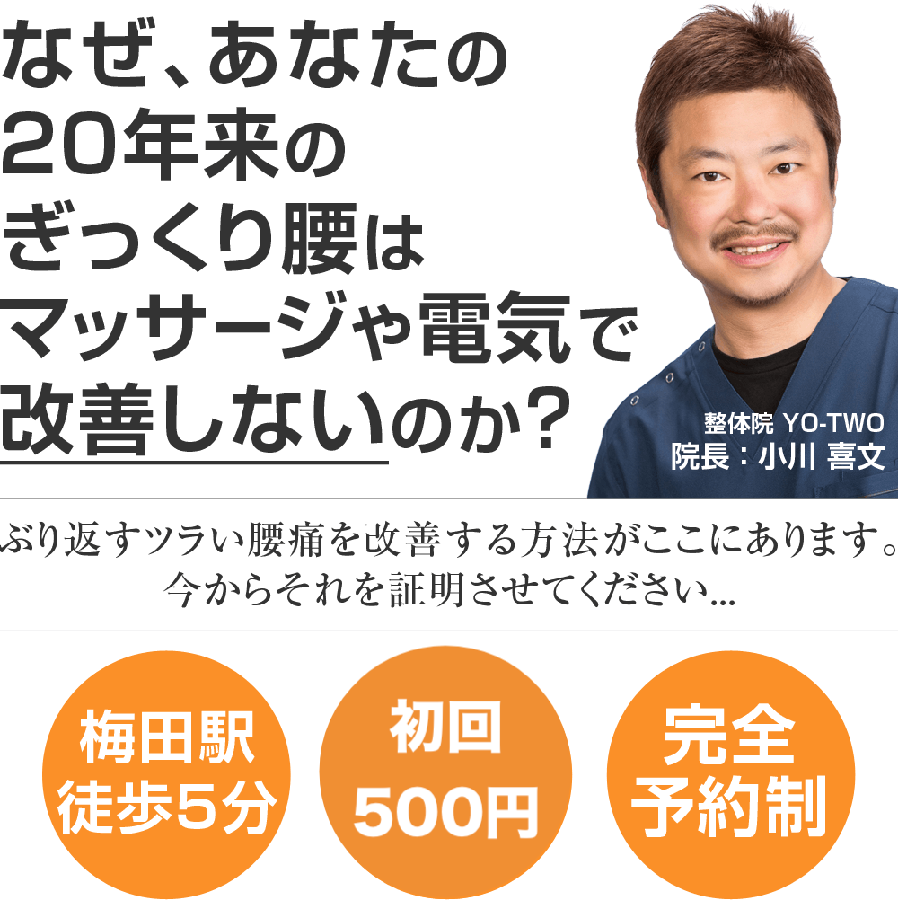 国家資格を持ち、病院勤務・整骨院院長経験で多くの経験を持つ、あなたの症状に真正面から向き合ってくれる大阪で唯一のぎっくり腰専門整体院YO-TWOに来院し、もう二度とその痛みに我慢することのない人生を手に入れる道。