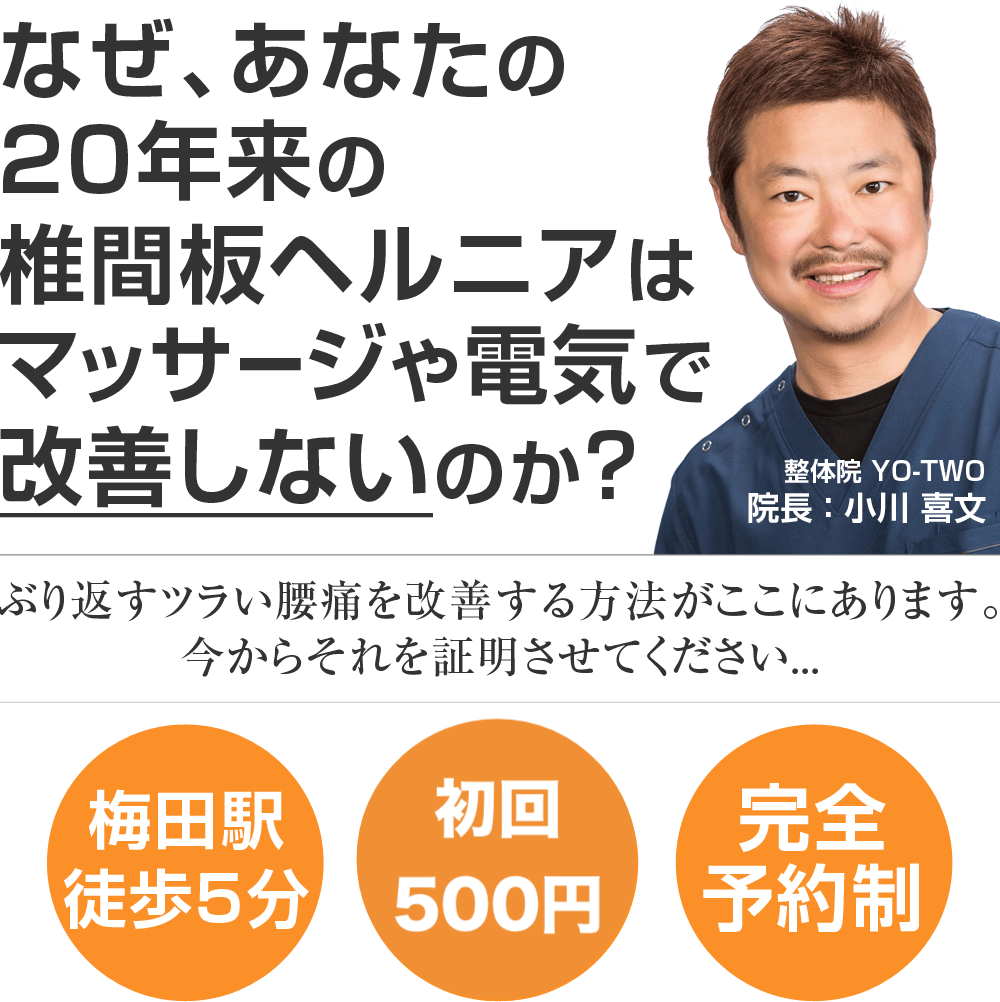 国家資格を持ち、病院勤務・整骨院院長経験で多くの経験を持つ、あなたの症状に真正面から向き合ってくれる大阪で唯一の椎間板ヘルニア専門整体院YO-TWOに来院し、もう二度とその痛みに我慢することのない人生を手に入れる道。
