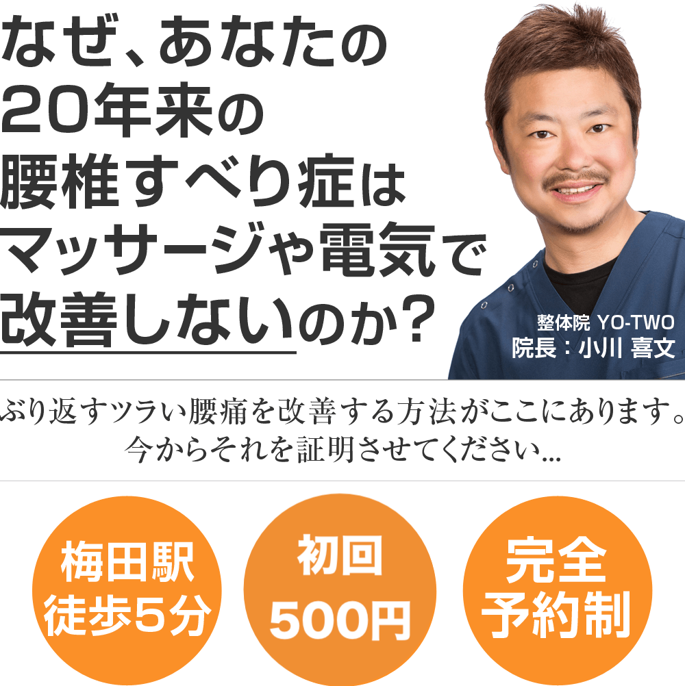 国家資格を持ち、病院勤務・整骨院院長経験で多くの経験を持つ、あなたの症状に真正面から向き合ってくれる大阪で唯一の腰椎すべり症専門整体院YO-TWOに来院し、もう二度とその痛みに我慢することのない人生を手に入れる道。